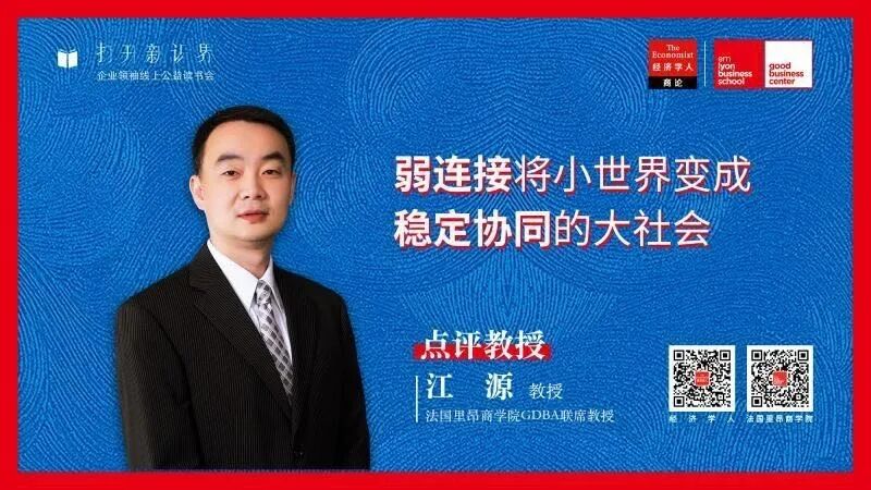 建立于1872年的欧洲著名百年商业学府——法国里昂商学院与成立于1843年的欧洲著名百年经济杂志《经济学人》携手,于2020年2月19日献上公益栏目——方舟读书会,为读者开启百年文化传承的东西方思想交融的学习之旅。法国里昂商学院GDBA联席教授江源则透过学者视角,围绕此次主题,对社会网络做出科普性介绍、并且联系组织管理中组织创新、变革,讨论社会网络的功能和作用。